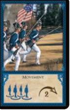 Ex: For the movement card shown, the American Regulars player may move up to four different armies two areas each. None of these armies or any of their units may be moved twice. (Some Special Cards grant an army added movement range).