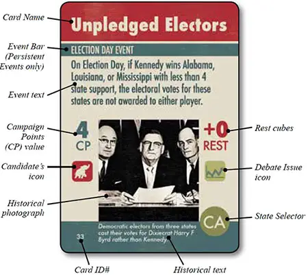 Most turns consist of playing cards either as Events or for Campaign Points (CP) that may be spent on campaign operations designed to gain State, Media, or Issue Support. Events can have a wide range of effects that often involve gains or losses of these three types of Support as well.