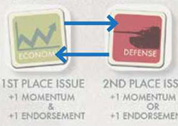 After adjusting the Issues Track, players are awarded momentum markers and/or Endorsement Cards for leading each issue based on its current position on the Issues Track:
