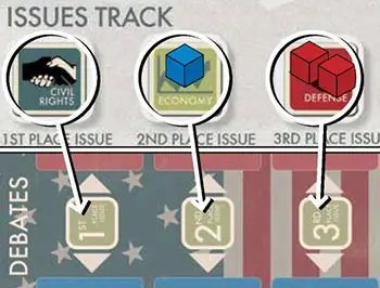Place the Debate Board between the two players. Remove all three issue tiles from the Issues Track and place them into the corresponding spots on the Debate Board-the first place issue goes onto the spot labeled "First Place Issue" and so on.