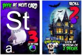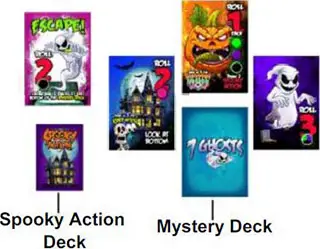 Note: A player receives a "spooky action" card if at any time during their turn the dice show one of each color (aqua, purple, and black). Only one spooky action card per turn is received based on the dice roll.