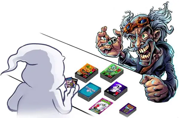 Then give each player one starting "spooky action" card. These cards are used to help you capture cards from the main deck, and hinder your opponents from doing so. Spooky action cards are earned as the game progresses by dice rolls (discussed later) and awarded when winning some of the main deck cards.