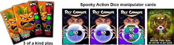 The player can then reroll one, two, or three dice as needed. If they are unsuccessful, they can play cards from their "spooky action" hand before their turn is over.