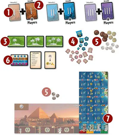 7 Give each player a Dockyard board - which they should place vertically to the right of their Wonder board - and one Ship figure of each color. Place these figures on the Start space of their color.