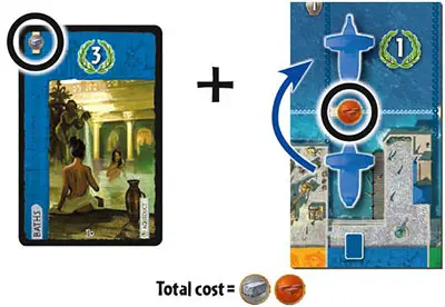 Example: Gabriel constructs a Blue card and so may perform a Blue Naval Construction. His card costs 1 Stone and his Naval Construction costs 1 Clay. He must thus pay a total of 1 Stone and 1 Clay to be able to perform both constructions.