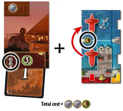 Example: Ann wants to construct the first stage of her Wonder, Giza, which costs 2 Stones. As the Wonder symbol on her Dockyard board is located on her Red fleet, she also performs a Naval Construction which costs 1 Wood. She must thus pay a total of 2 Stones and 1 Wood to be able to perform both constructions.