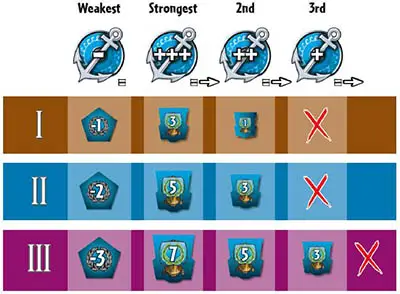 Example: In Age II, Gabriel and Paula have the weakest Naval Strength with 2 Naval Shields, so they each gain a Naval Defeat token of value -2. Ann has the strongest Naval Strength with 8 Naval Shields, so she gains a Naval Victory token of value 5. Romeo and Fred are tied for the second-strongest Naval Strength with 6 Naval Shields each. Since they're tied, they should gain the reward for a rank lower, but there aren't any in Age I. These two players thus gain no tokens.