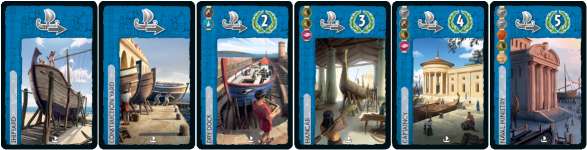 These cards allow the player to freely move one of their Ships, of their choice, upward one space (without having to pay the cost in resources or in Coins). Some of these cards also grant Victory Points (0/0/2/3/4/5 respectively).