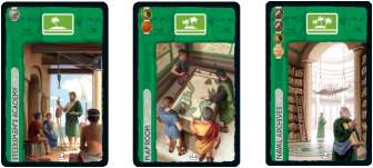 Example: Romeo played the Philosophers' Guild and the Traders' Guild. The player to his left has 7 Green cards and 4 Yellow cards, and the player to his right has 5 Green cards and 2 Yellow cards. Romeo gets 10 Victory Points for the Philosophers' Guild (and not 12 as he would otherwise), and 6 Victory Points for the Traders' Guild at the end of the game, which gives him a total of 16 Victory Points for his two Guilds.