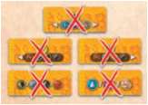 Example: At the end of Age II, Derek possesses 2 Participation tokens, but gets nothing as there are still tokens on the Archives card. Tom, however, does not have a single token, and must thus suffer the penalty shown on the Archives card and lose a blue card of his choice.