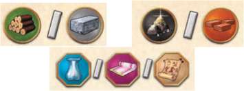 The construction of civil buildings (blue cards) or of Guilds (purple cards) via resources is forbidden. Their construction requires a number of coins equal to the number of resources present in their construction cost. These coins are paid to the bank.