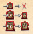 /Example: There are already three Babel tiles built. Dale and Brian both take part in constructing Babel this turn. They play their Babel tiles face down next to the board. At the end of the turn, the 2 tiles are revealed, first we place tile 4, then tile 12. Tile 4 is placed on the last free space, and tile 12 covers the first tile played.