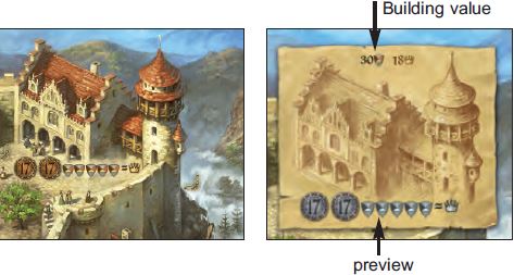 Each tile is marked with the building value a player must pay in resources for the building. The bottom line on the tiles shows a preview of what helpers in the (erected) building offer for the final scoring and how much in fees the players will have to pay when placing a helper.
