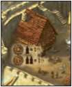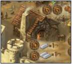 Example: The stable has a building value of 18. That means a player can erect a stable with, for example, 2 stone blocks, 1 clay slab, and 4 sand piles. This uses 3 kinds of resources and sums to a total of 18 building points.
