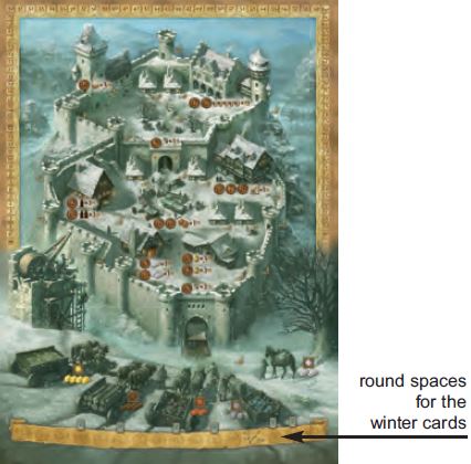 First, each player plays one or 2 character cards as usual face down in his play area. In each round marked with a winter card, one winter card is brought into the game: the starting player draws the top card from the stack and reads the card aloud. Then he puts it face up next to the castle, easily visible to all players.