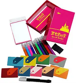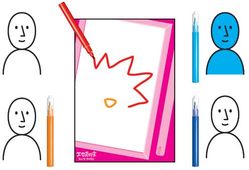 Artists then select a color marker. The question master decides who makes the first mark. Moving clockwise each artist makes a mark to create the masterpiece. This continues for two rounds.