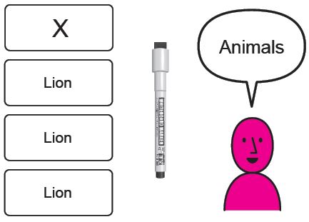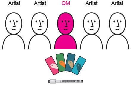 The Question Master shuffles the title cards and places one in front of each artist. Each artist turns over their card but shouldn't reveal the subject. The person who turns over the "X" is the fake artist.