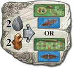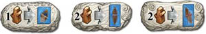 On these three action spaces, you can exchange stone and/or wood or ore for blue "rune stone" and "chest" tiles. On the first two of these spaces, you also receive 1 silver.