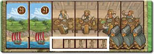 Here, you can extort ransom money in the form of a blue "silver hoard" goods tile without battle-but you must have at least two longships to do so.