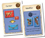 At any time, you may place orange farm goods, red animal products, green craft products, and blue luxury goods as well as silver coins on empty spaces of your houses.