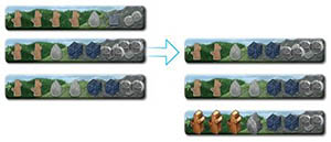 In this phase, remove the leftmost resource (i.e., closest to the arrow) from each face-up mountain strip and return it to the general supply (this can be wood, stone, ore or silver).