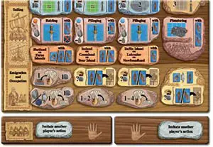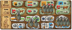 The action spaces on the action board are organized in groups of similar effects. The wood grain background helps to emphasize this. The type of action spaces in each group is stated in the left margin of the action board.