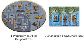 Place the special tiles on the oval supply board. The other supply board is for the three types of ships. Sort the ships by type and place them face up in separate stacks on the supply board.