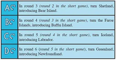 Example: In round 3, 2 silver are placed on the Faroe Islands. In round 4, the Faroe Islands are turned to become Baffin Island and the 2 silver placed there last round are returned to the general supply.
