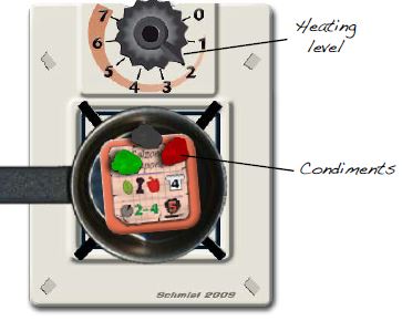 (2 times in the game): The player may reduce his or her heating level by 1, 2, or 3 levels. This is also allowed, if his or her dish already was burnt (even at level "7").