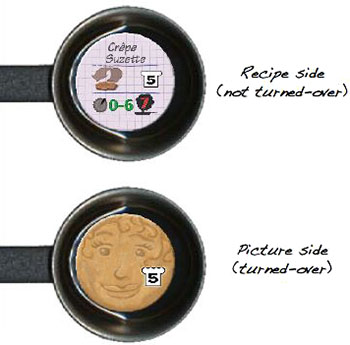 The crepe lands with its image side up and is therefore finished. The heating level does not matter, as long as the "7" was not reached yet (thus, even "0" is valid!). The player places the crepe to his or her other Finished Dishes and chooses a new dish for the pan. The player's turn ends immediately and the next player's turn starts.