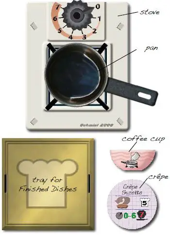 (3 times in the game): The player exchanges his or her stove including pan and dish with another player of his or her choice. Both players then continue the play with their new stoves.