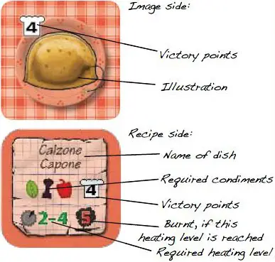 The player takes the dish out of the pan and puts it on his or her Finished Dishes tray, illustration side up. At the end of the game the dish scores the victory points printed on the token. The condiments (if any) are put into the sink.