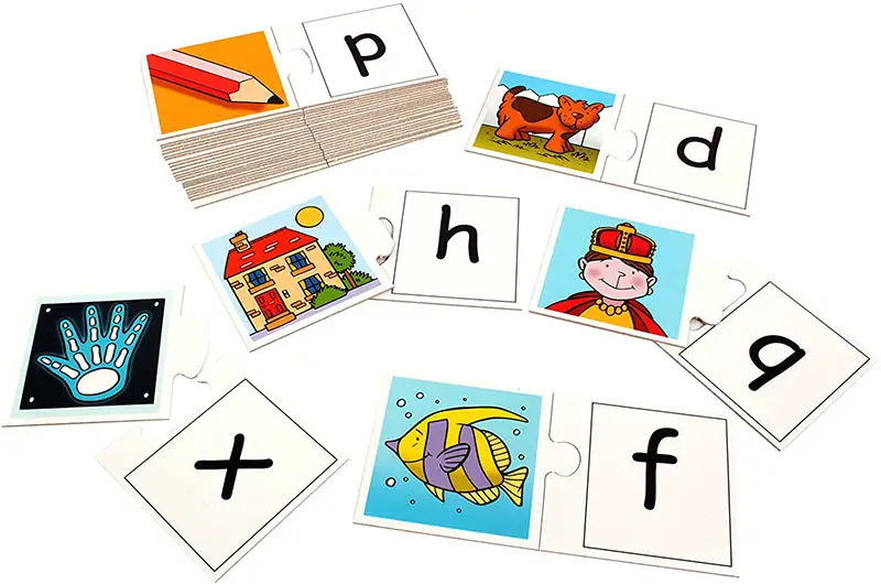 The puzzle design of the cards means that only the correct picture will fit with any given letter.