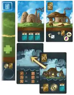After the player gains the reward, he moves any villagers remaining on the cave card to the exhausted area on his player board. He places the cave card to the right of his player board, underneath his row of houses, in the same row as other cave cards and outposts he already owns.