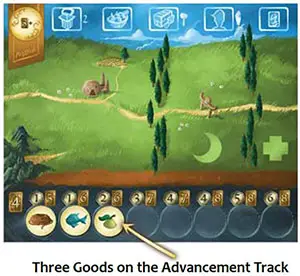 A player's advancement track is the row of circles along the bottom of his player board. A player may place available goods on this track at any time. He must place goods from left to right, not leaving any empty slots.