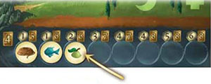 Players count up village points for each goods token on the advancement track. The amount each token is worth is indicated just above the slot on the board. In the example below, if a player had four fruit on the third slot, he would gain 2 village points each for a total of 8 village points.