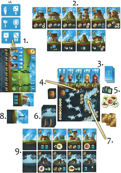 Shuffle the cave cards and place them in a pile face up next to the reputation board.