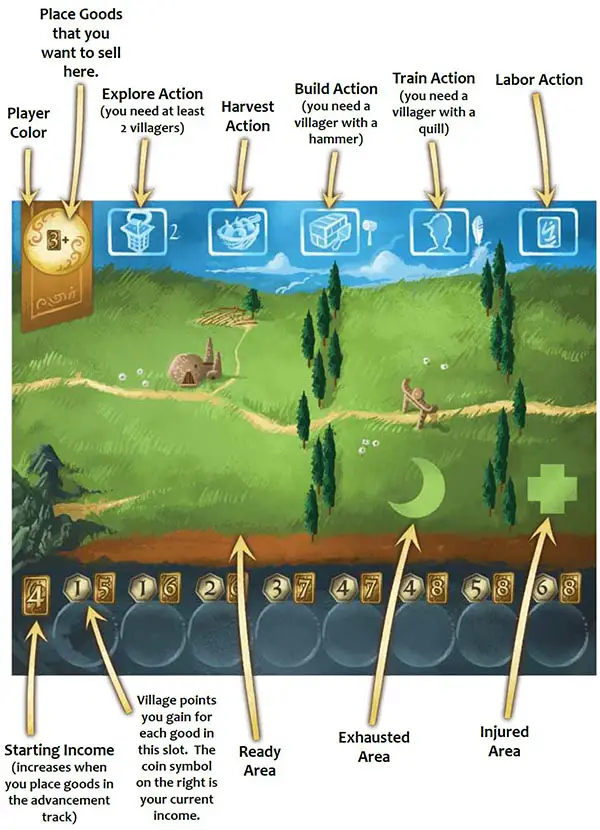 Give each player a player board, seven coins, 1 starting house card, and 1 of each type of starting villager (3 villagers total for each player). The starting villagers have a house on the back of the token. The 3 villagers should have the symbols depicted at "1A", and start in the large grass area furthest to the left on the player board--the "ready area".
