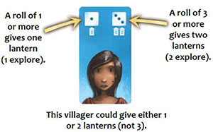 After all dice have been rolled, the active player adds the total number of lanterns from his villagers. If the total is equal to or greater than one of the explore numbers associated with his choice, he succeeds. If he does not have a sufficient number of lanterns, he may then choose to Exert one or more of his villagers to gain extra lanterns.