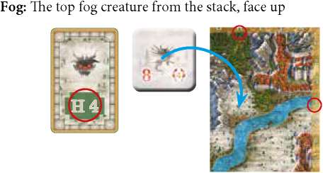 Important: After placing the fog creature on its game board field, you need to draw another terrain card from the stack for each uncovered fog creature and place the appropriate tile.