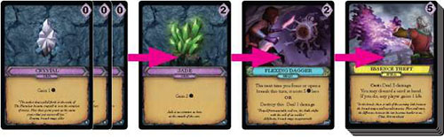 Place all the gems and relics that you have played this turn on the top of your discard pile in any order you choose. Draw cards from the top of your deck until you have five cards in hand.