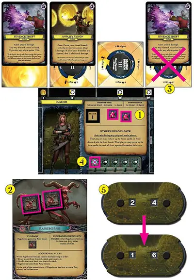 Each round, the players and the nemesis will take turns in a random order. During a player's turn, they will be able to cast spells, acquire additional gems, relics and spells from the supply, manipulate their spell casting breaches and use their unique abilities. All four of the different nemeses included in the game are unique in the actions taken during their turns, and will require a different strategy to defeat.