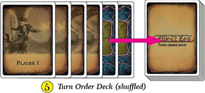 Aeon's End has a variable turn order which is determined by the turn order deck. At the start of the game and after each player or nemesis turn ends, draw a card from the turn order deck to determine who takes the next turn. Place that card on the top of the turn order discard pile.