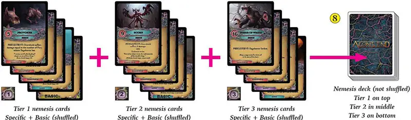 Place the tier 3 cards on bottom facedown, the tier 2 cards facedown on top of the tier 3 cards, and the tier 1 cards facedown on top of the tier 2 cards. Combined, these tiers form the nemesis deck.