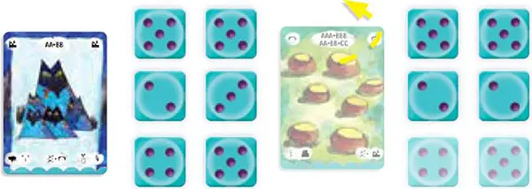 Note that sets of results do not need do be different (for example, AA+BB could be two pairs of the same number), but the A+B+C+D+E result is a set of dice in numerical order, either from 1 to 5 or from 2 to 6.