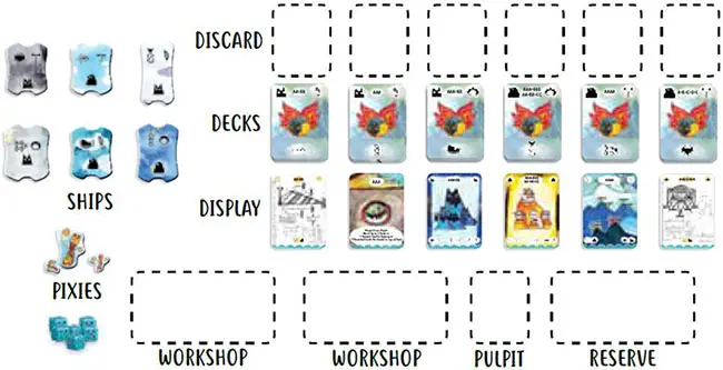 The six faceup cards form the Display. Leave room under the Display for four separate areas: two Workshops, one Pulpit and one Reserve.