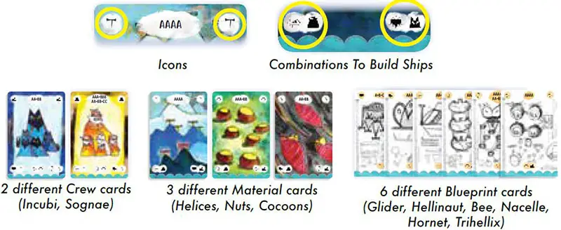 There are three Elements needed to build each Ship: one Blueprint, one Material, and one Crew, shown on the Project side of each Ship token. Each of these Element cards shows its own icon in each of the top corners.