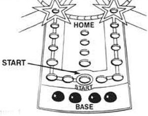 Before any marble can be moved around the board it must be moved from the BASE row and entered into the START hole. See Figure 1. You can "start1 a marble on a die roll of 1 or 6 only. Once a marble is in START, it can be moved on your next turn.
