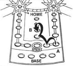 Marble is located in Star hole (A). You roll a 5 and move the marble around the Star holes to the path leading to your HOME (B). You then have 2 moves left on your die roll and move your marble down the path to hole (C).