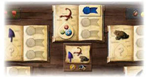 To publish a theory, pick up one of the alchemical tokens and place it on one of the books on the theory board. This is your public statement about the true identity of the ingredient depicted on that book. To mark it as yours, place one of your seals face down on any of the seal spaces.